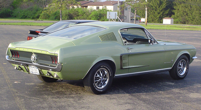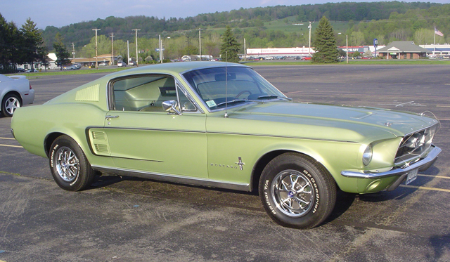 1967 Mustang Fastback, lime gold, 25,500 original miles, 390 CID, 335 HP, S code, 4 speed toploader transmission, Interior decor group, exterior decor group, 3.75 rear gears, limited slip differential, heavy duty suspension. Other options include AM radio with 8 track player, interior courtesy warning lights (rare) located in brushed aluminum dash, original interior overhead map light console (rare), original exterior finned aluminum rear valence (rare). Won Best of Show at the Castle Creek Civic Center Car Show (Sept. 04), 1st place Mustang Division at the Tompkins Seneca-Tioga BOCES Car Show (May 05), 1st Place 67-68 Mustang Division at the Syracuse All-Ford Show at Longbranch Park (June 05), 1st Place Muscle Car Division at the Cortland Antique Car Club Car Show at Little York Park (Sept. 05).